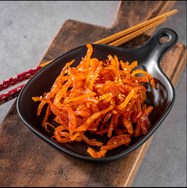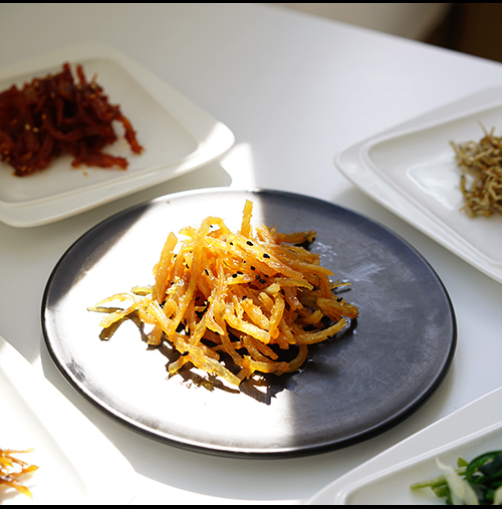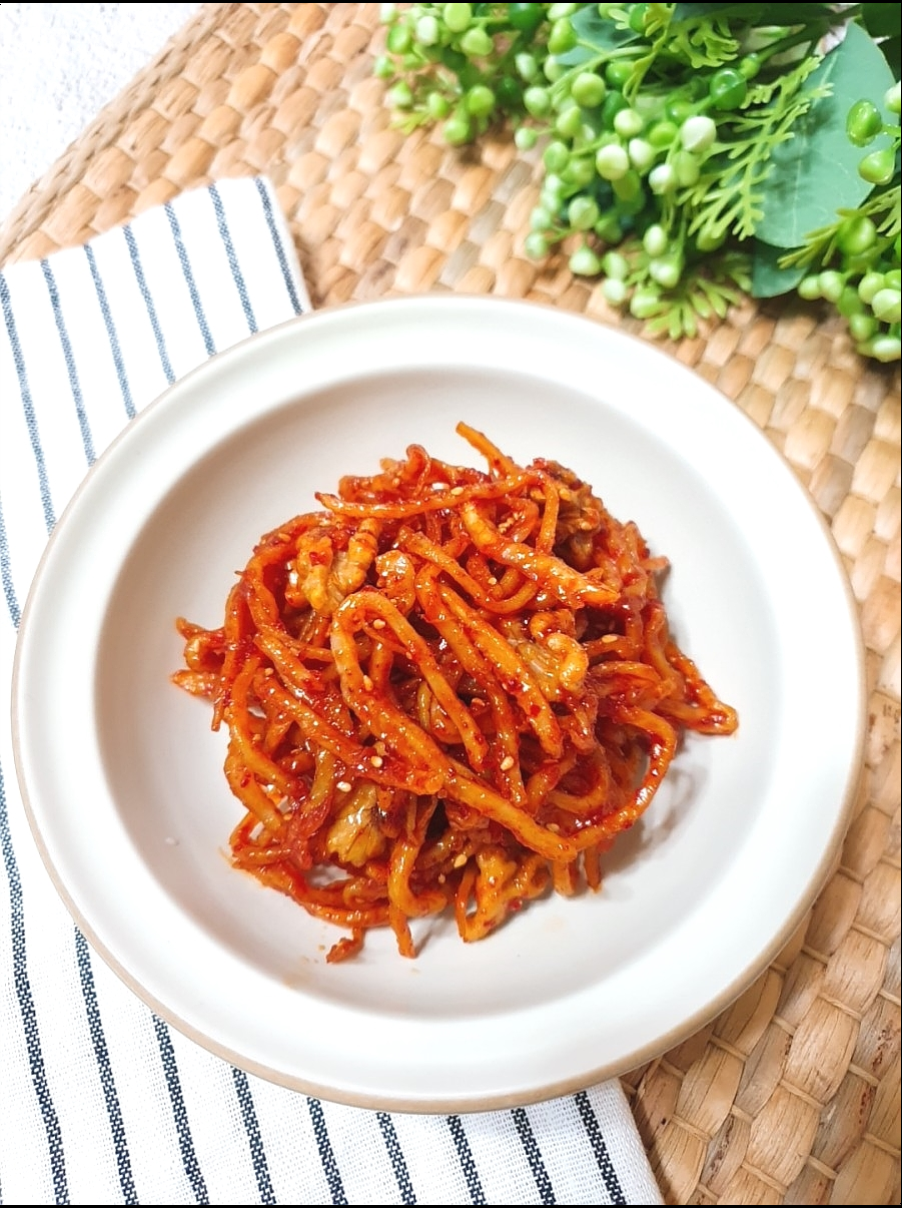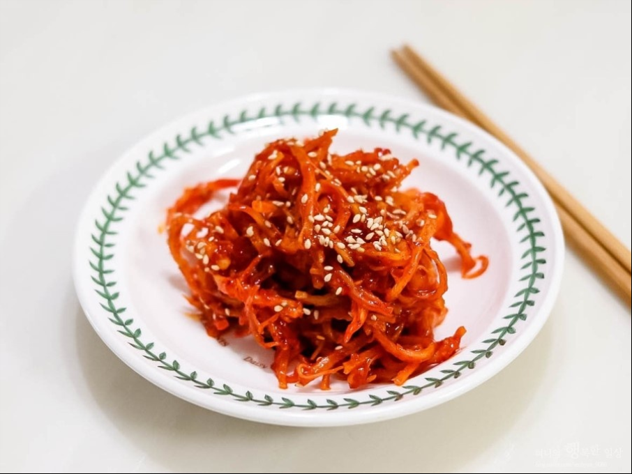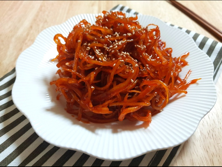 촉촉하고 쫄깃한 맛이 일품인 진미채 볶음이 완성되었습니다. 원칙적으로 진미채의 황금레시피라고 한다면 설탕을 넣는 경우가 많은데, 설탕을 넣으면 딱딱해져 먹기 어려워지기 때문에 비법은 설탕을 안 넣는 방법입니다.설탕 대신 올리고당을 선택하고 물엿을 넣지 않는 것이 식감에 좋습니다.